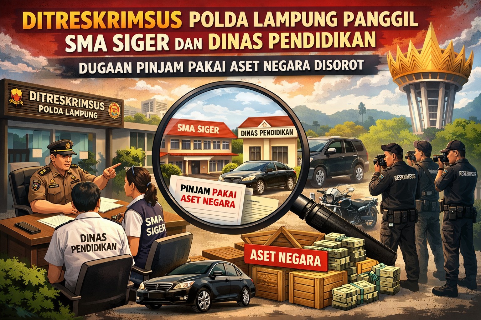 DJADIN MEDIA- Ditreskrimsus Polda Lampung memanggil pihak SMA Swasta Siger dan Dinas Pendidikan Kota Bandar Lampung untuk memberikan klarifikasi terkait dugaan pinjam pakai aset negara. Pemanggilan ini muncul setelah laporan penggiat publik Abdullah Sani pada November 2025, yang menyoroti legalitas administrasi perizinan dan pemanfaatan aset pemerintah di sekolah tersebut.