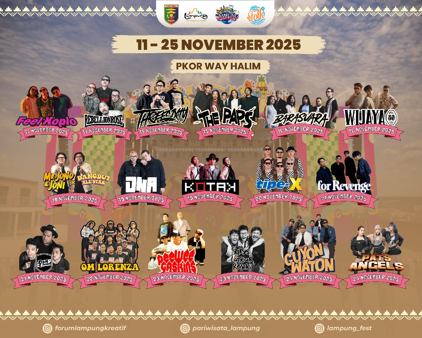 DJADIN MEDIA— antusiasme warga lampung untuk lampung fest 2025 semakin terasa menjelang puncak festival yang akan digelar pada 11–25 november 2025 di pkor way halim. salah satu segmen paling dinantikan, lampungphoria, dijadwalkan menjadi panggung musik lintas genre yang menghadirkan sensasi berbeda setiap malam, menyatukan penggemar musik dari berbagai kalangan dan usia.