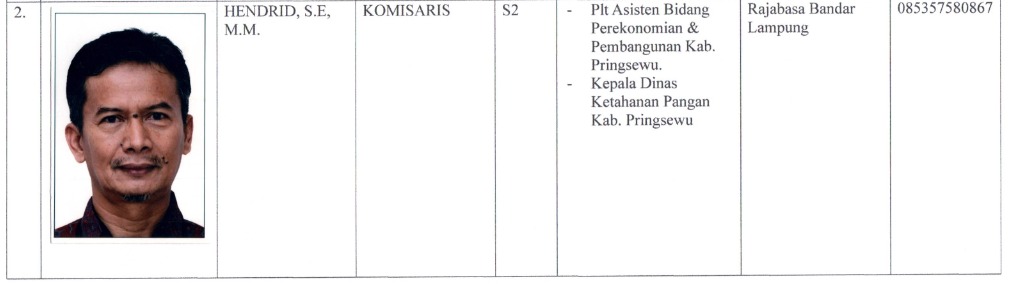 Di sisi pengawasan, Warsito mengisi posisi Komisaris. Beliau dikenal aktif dalam pengembangan masyarakat dan pendidikan di Lampung. Kiprahnya sebagai guru, dosen tutor, serta berbagai posisi strategis di Komisi Pemilihan Umum (KPU) Kabupaten Pringsewu dan Provinsi Lampung, memberikan nilai lebih dalam mengawasi tata kelola perusahaan.