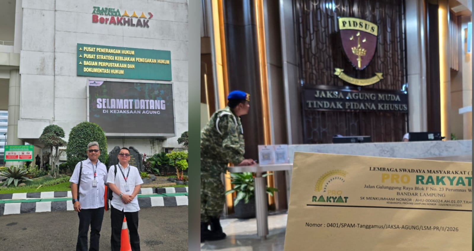 Pengaduan tersebut disampaikan langsung oleh Ketua Umum LSM PRO RAKYAT, Aqrobin AM, didampingi Sekretaris Umum Johan Alamsyah, S.E., dan telah didaftarkan secara resmi pada Rabu (11/2/2026).