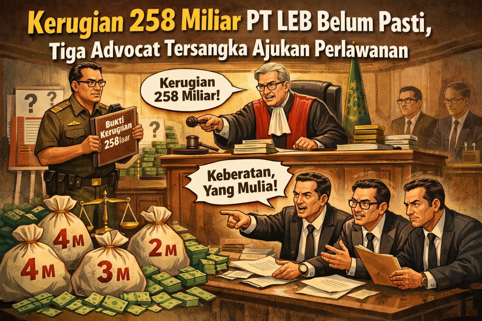 DJADIN MEDIA— Klaim kerugian negara senilai Rp258 miliar dalam perkara dugaan tindak pidana korupsi PT LEB kembali dipersoalkan di ruang sidang. Tiga advokat yang mewakili para tersangka kompak mengajukan perlawanan hukum karena menilai perhitungan kerugian negara tersebut belum memiliki dasar yang jelas dan terkesan prematur.
