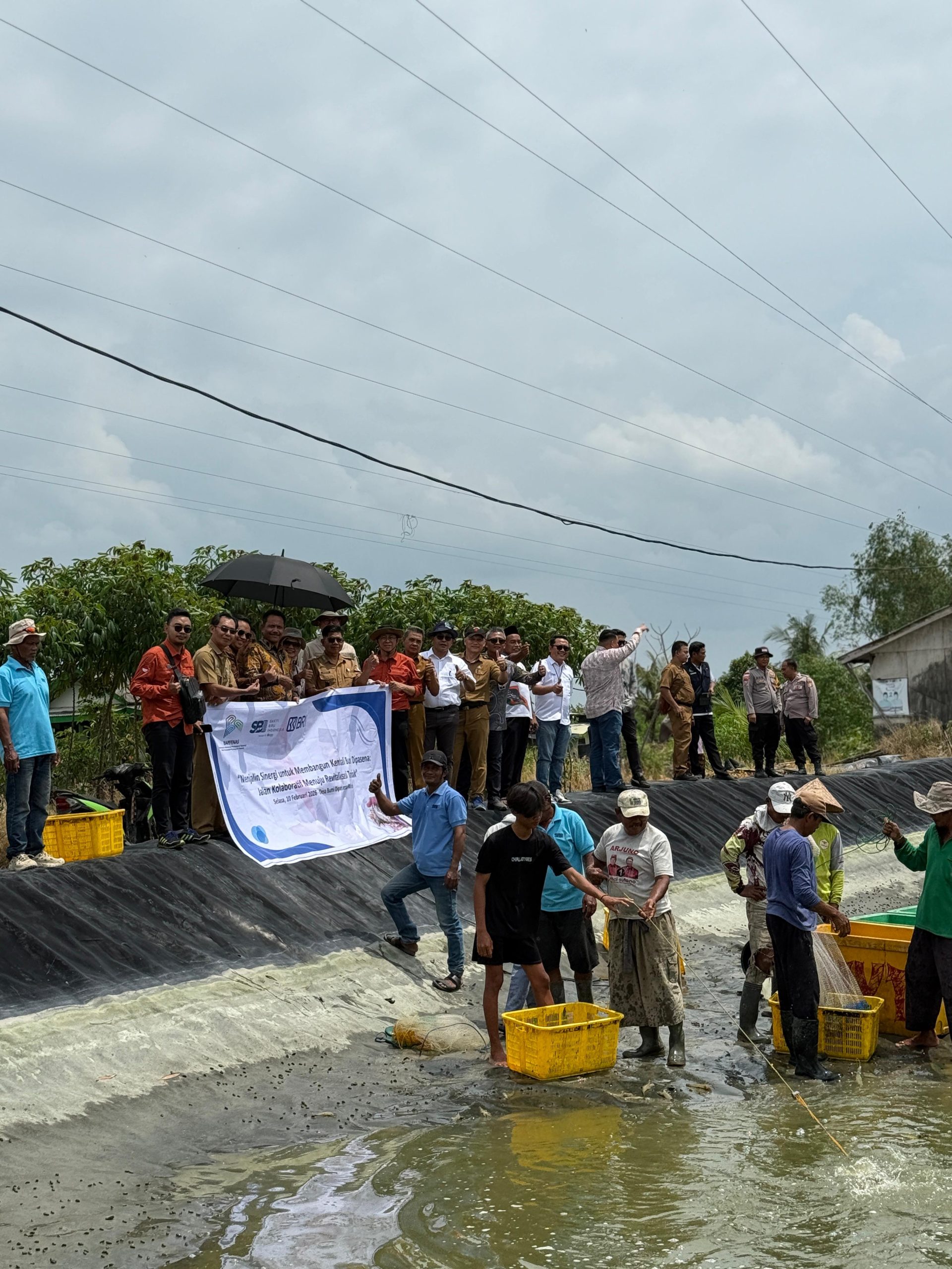 DJADIN MEDIA- Kebangkitan tambak eks Dipasena kian menunjukkan hasil konkret. PT Sakti Biru Indonesia (SBI) bersama Kementerian PPN/Bappenas dan Bank Rakyat Indonesia (BRI) menggelar panen udang Program Kemitraan Nasional di Desa Bumi Dipasena Makmur, Kecamatan Rawa Jitu Timur, Kabupaten Tulang Bawang, Selasa (10/2/2026). Panen udang ini menjadi simbol keberhasilan revitalisasi Dipasena yang kini kembali bergerak sebagai sentra budidaya udang nasional.
